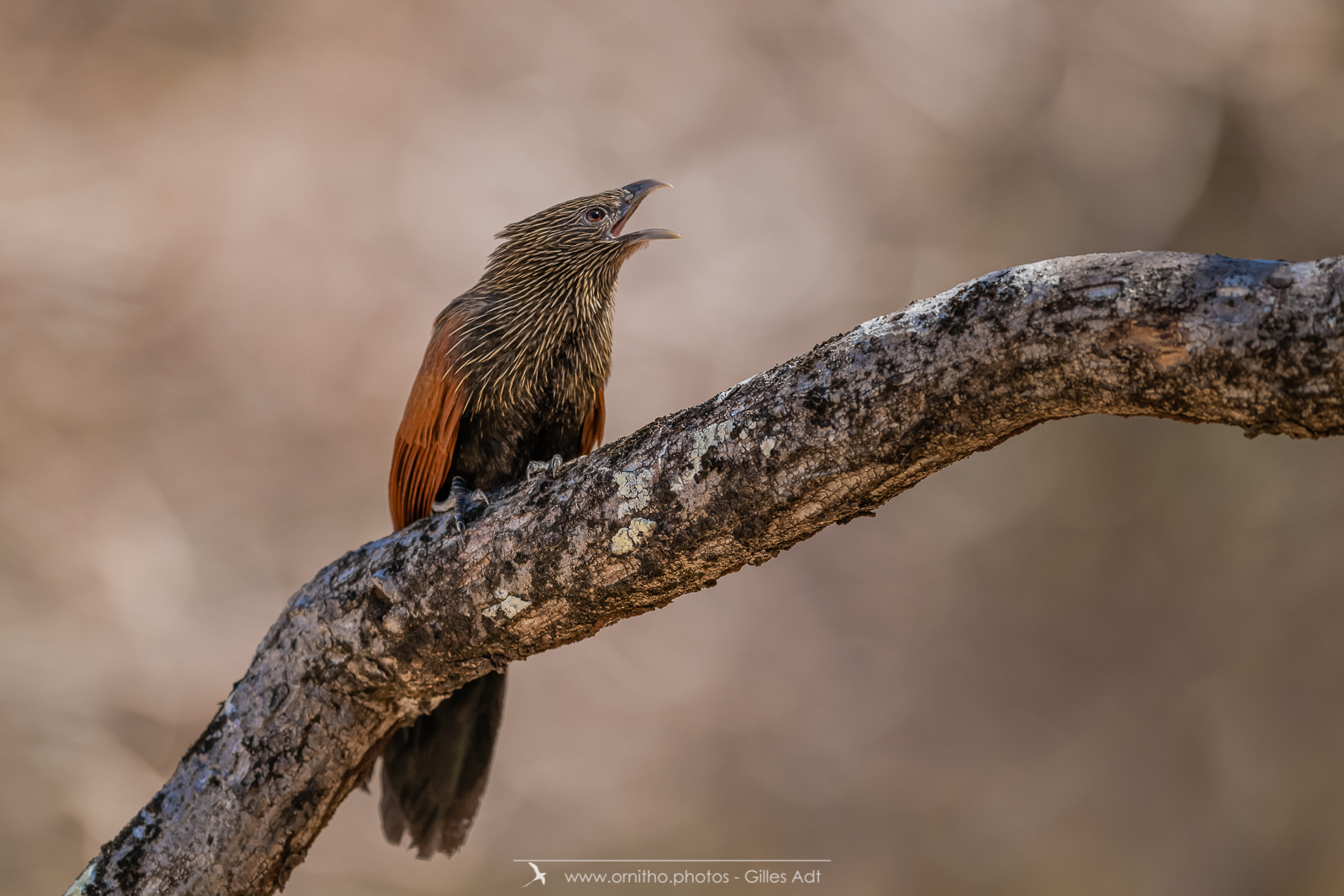 Ce qui m’a surpris avec le Coucal toulou c’est la différence de coloration du plumage entre période nuptiale et inter nuptiale : pendant la période de reproduction le plumage est noir brillant à l’exception du dos et des ailes roux vif. En plumage internuptial, la tête, le cou, le menton, la gorge et le manteau sont noirs fortement striés de beige. Le bec est brun rosé.