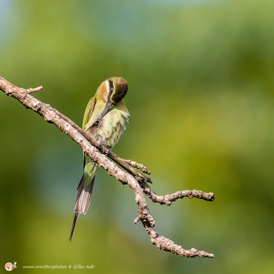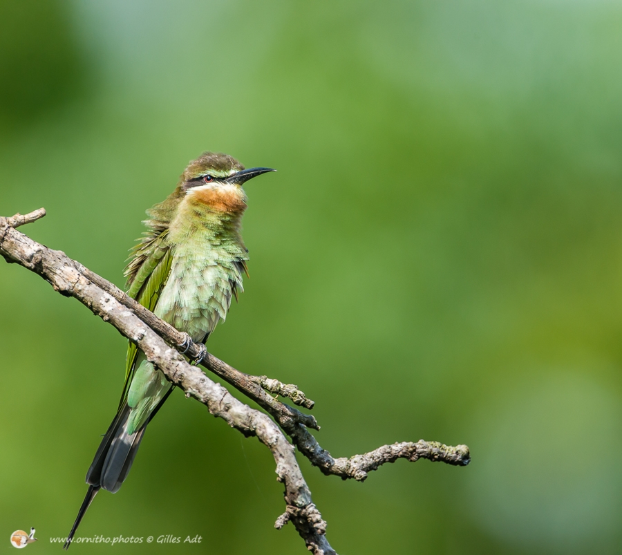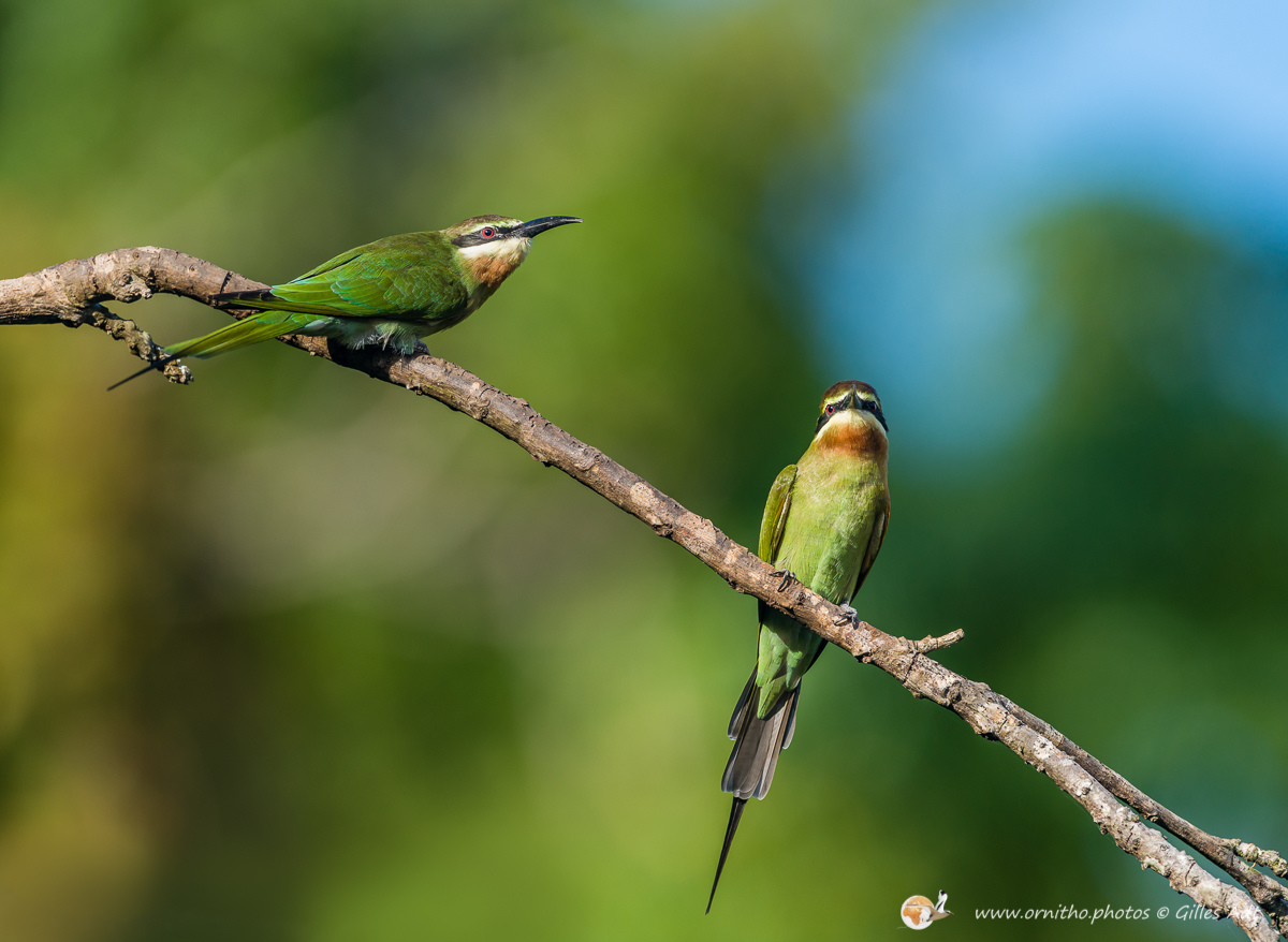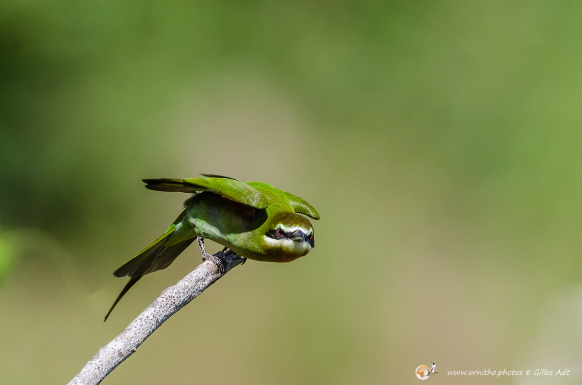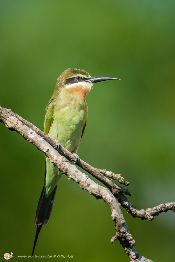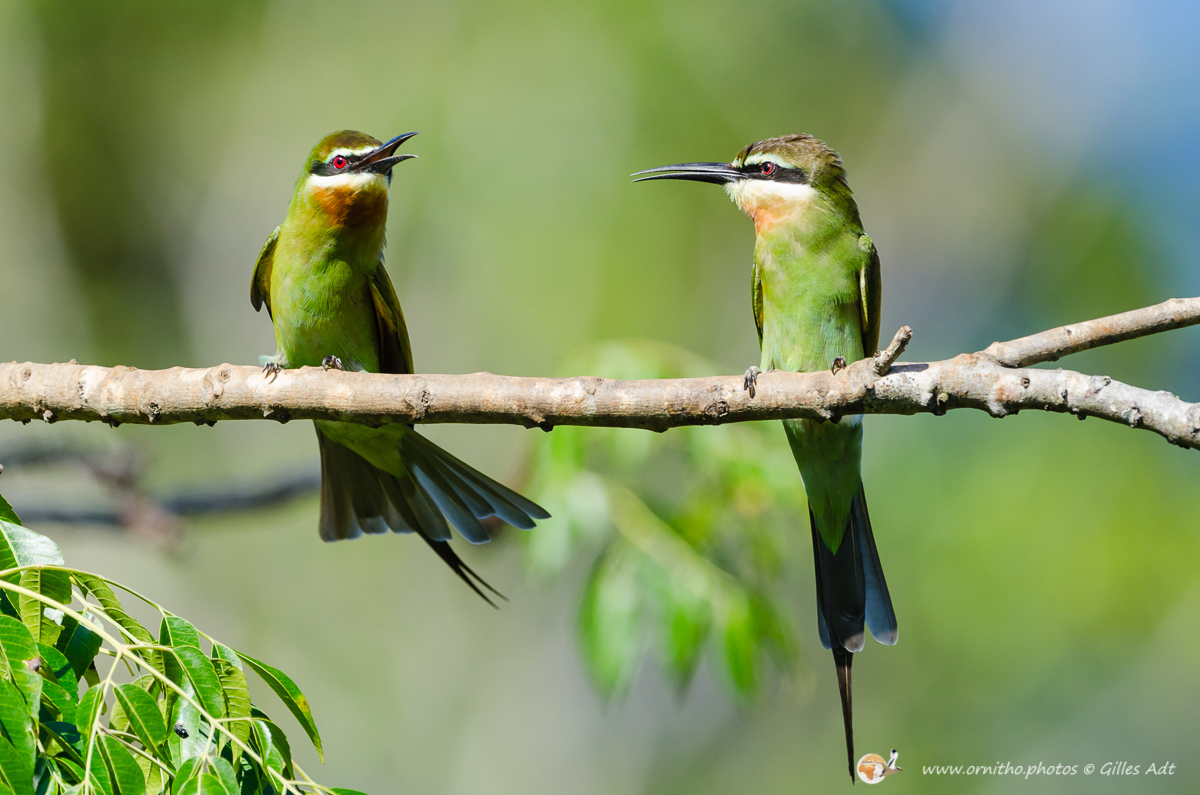 Avec son plumage à dominante verte et son masque noir barrant la tête, le guêpier de Madagascar (Merops superciliosus) est reconnaissable. Il vit en groupe aux abords des étendus d’eau et se nourrit d’insectes attrapés pendant des vols acrobatiques.