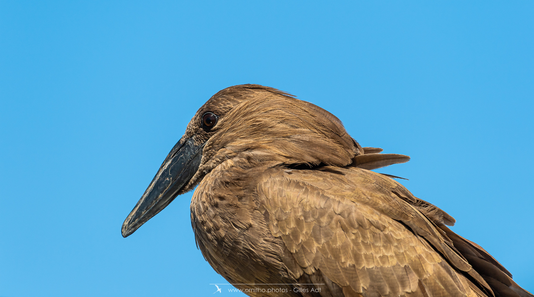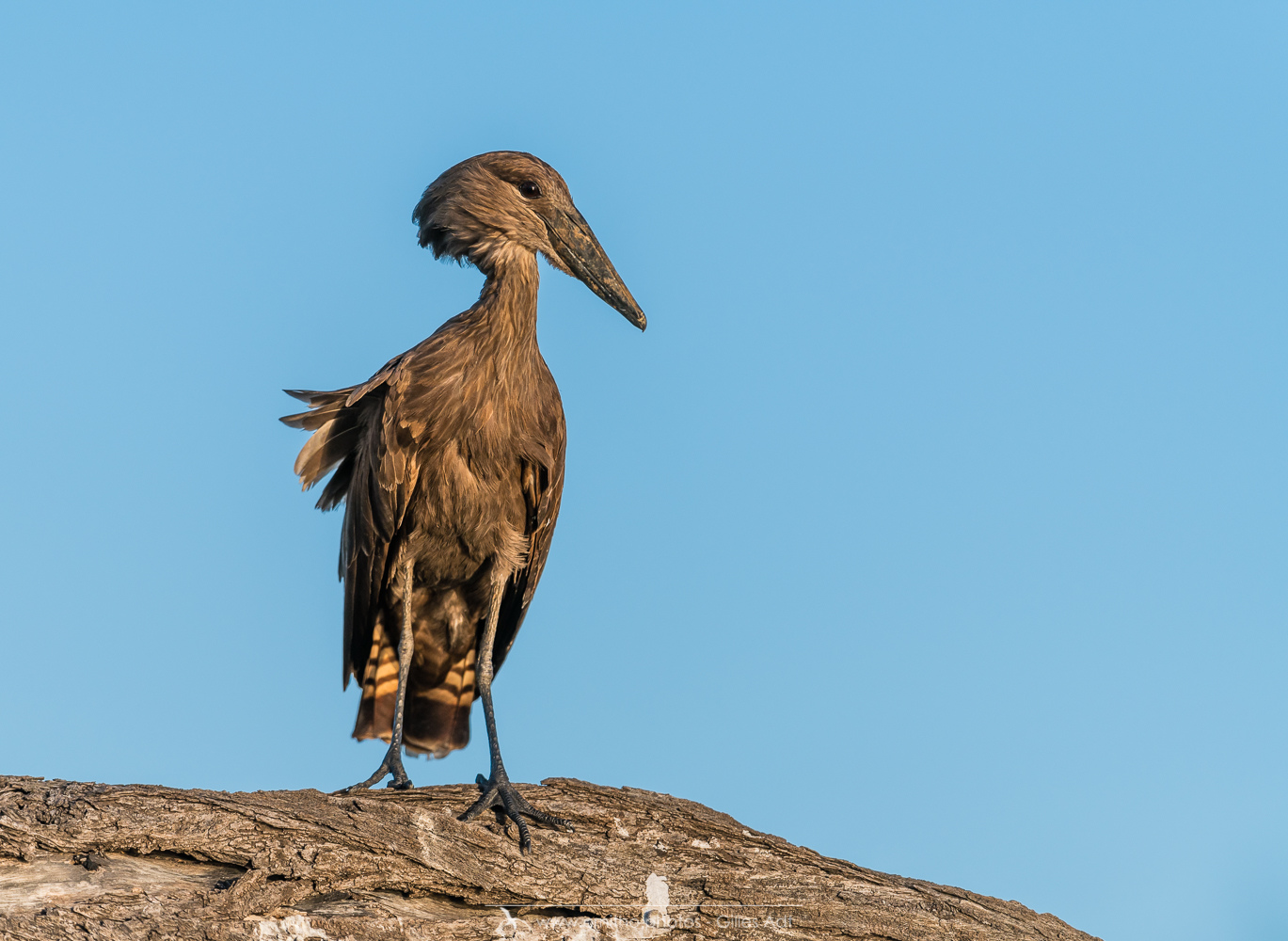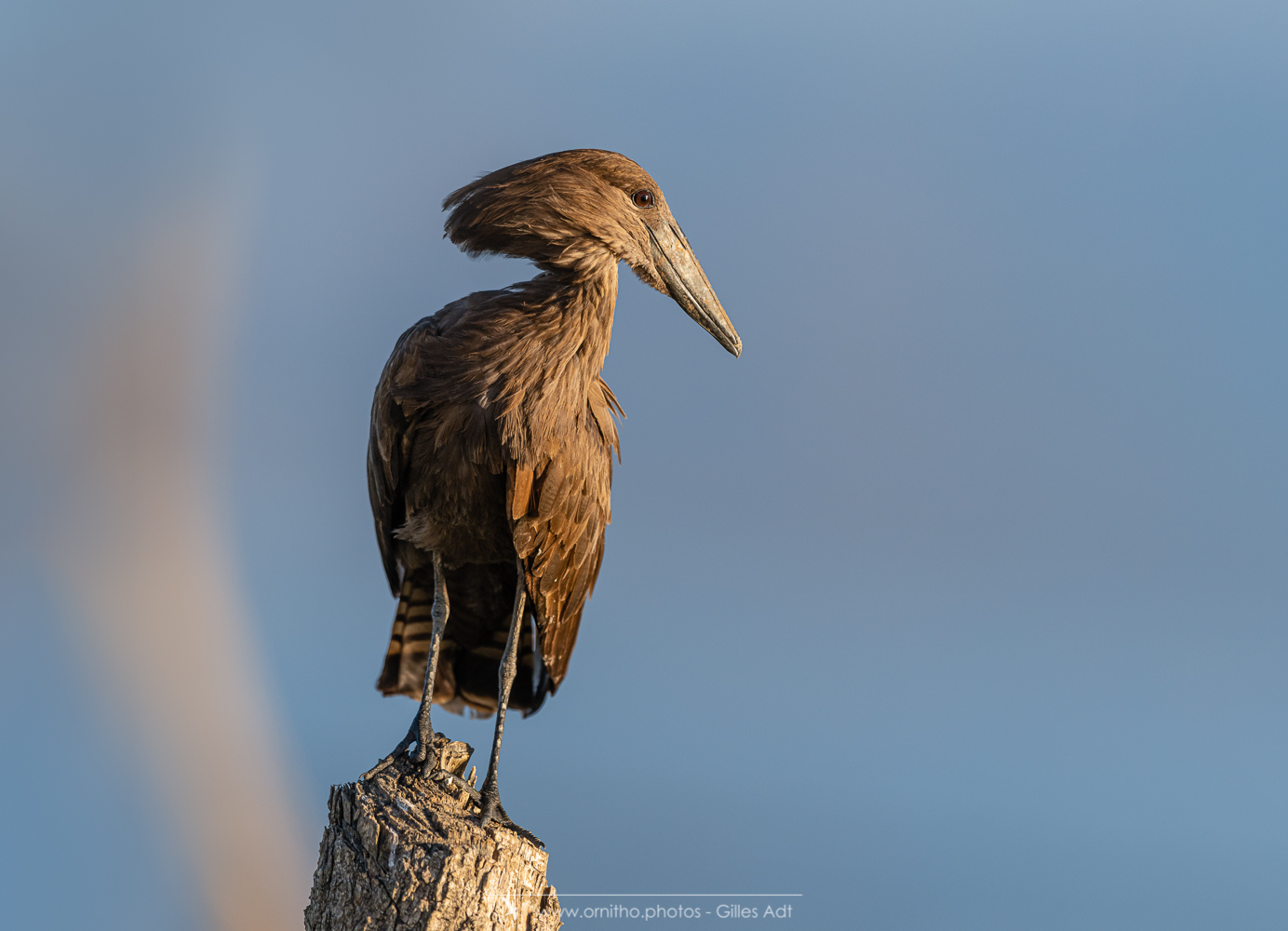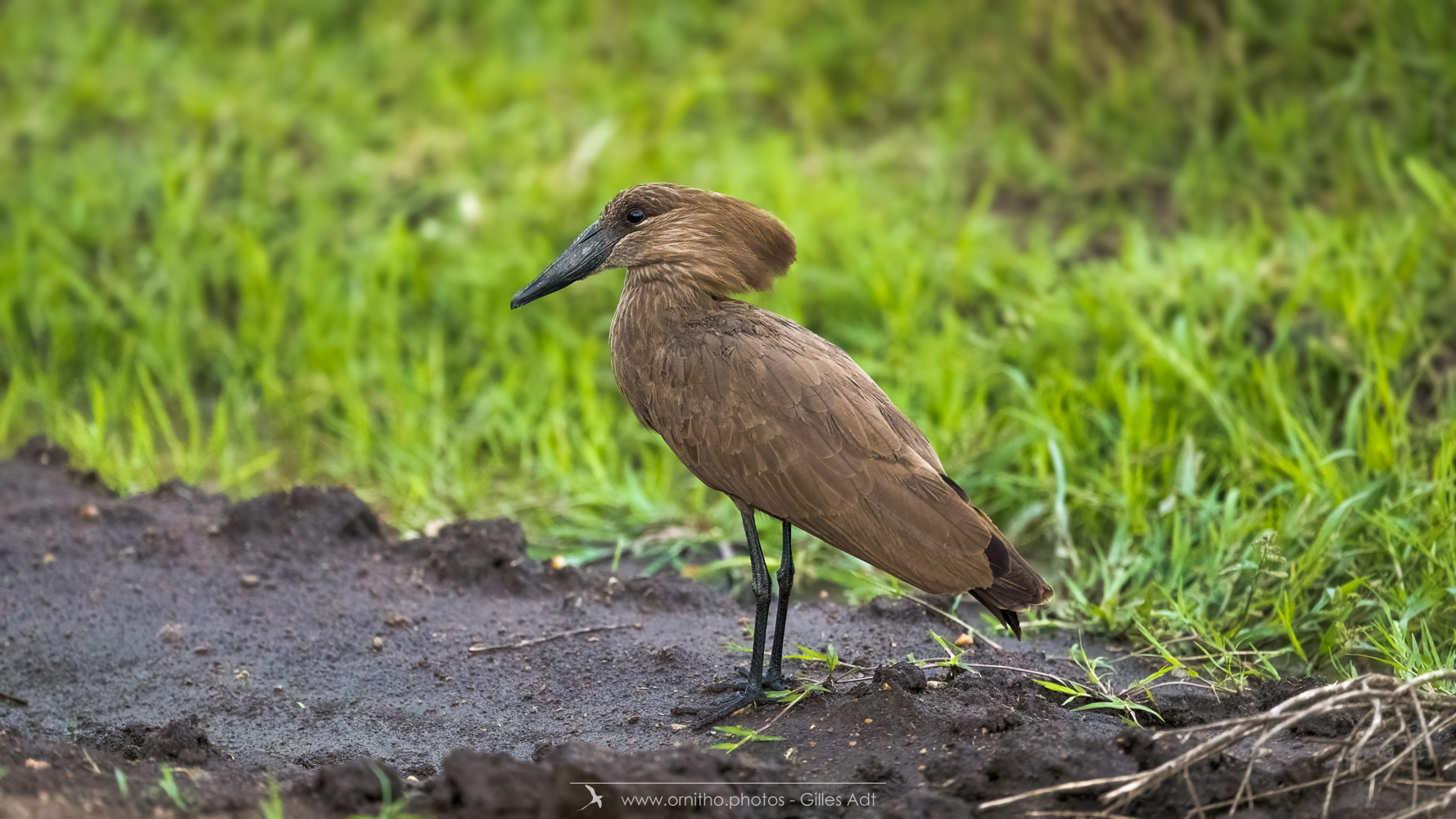 Encore un oiseau unique, l’Ombrette africaine (Scopus umbretta). Unique car le seul membre de la famille des Scopidae et par sa silhouette en « tête de marteau » due à une huppe de forme allongée
