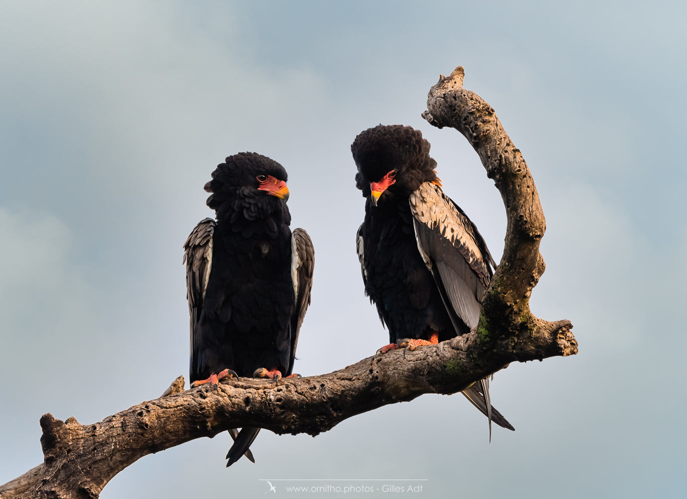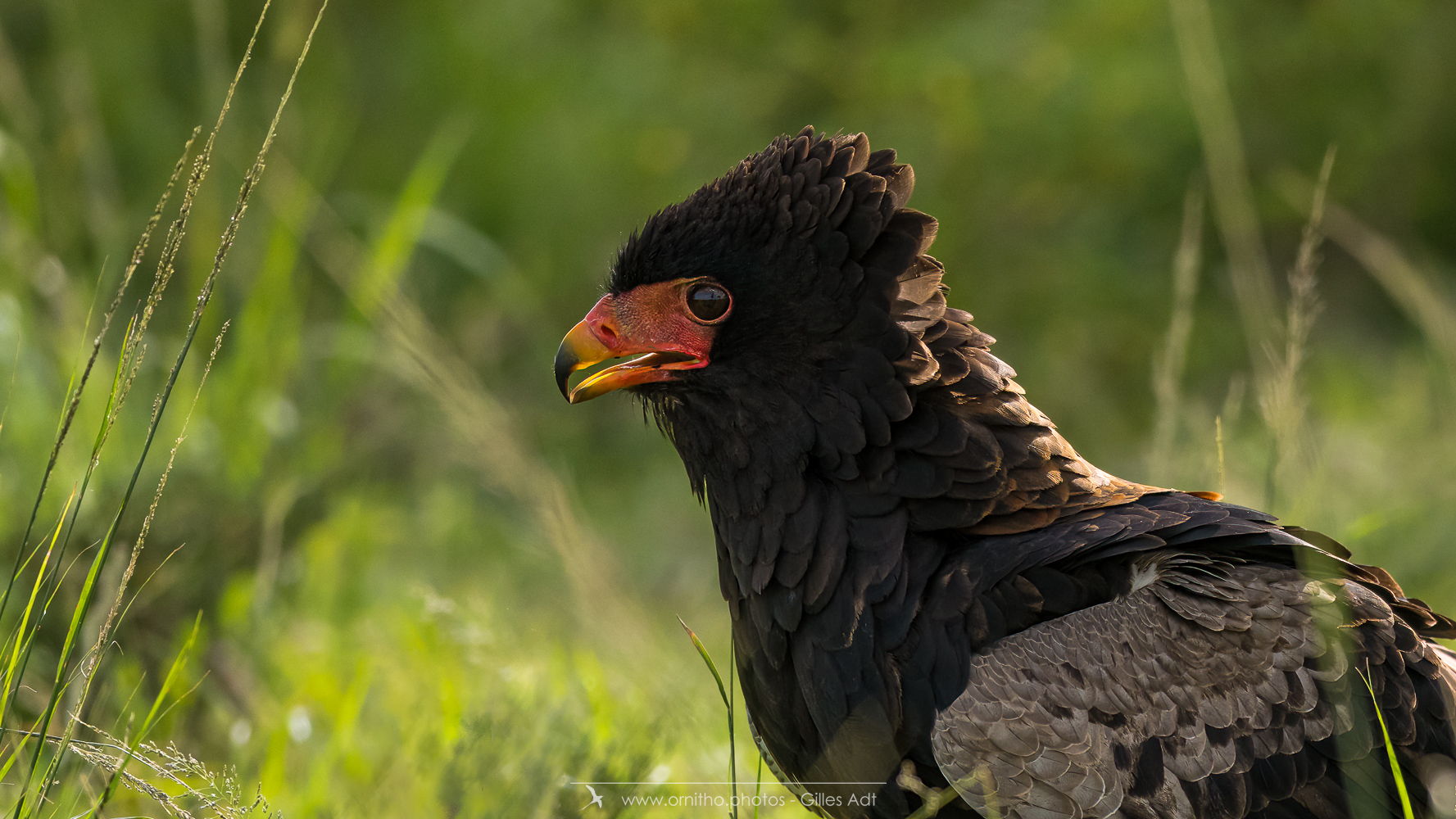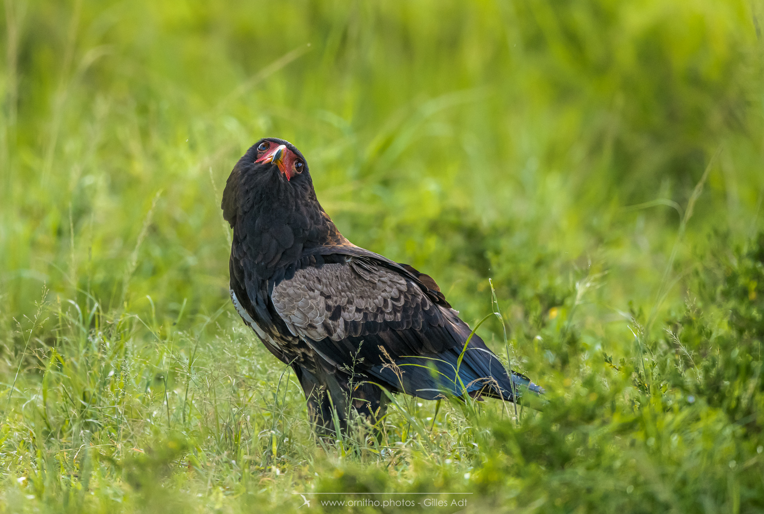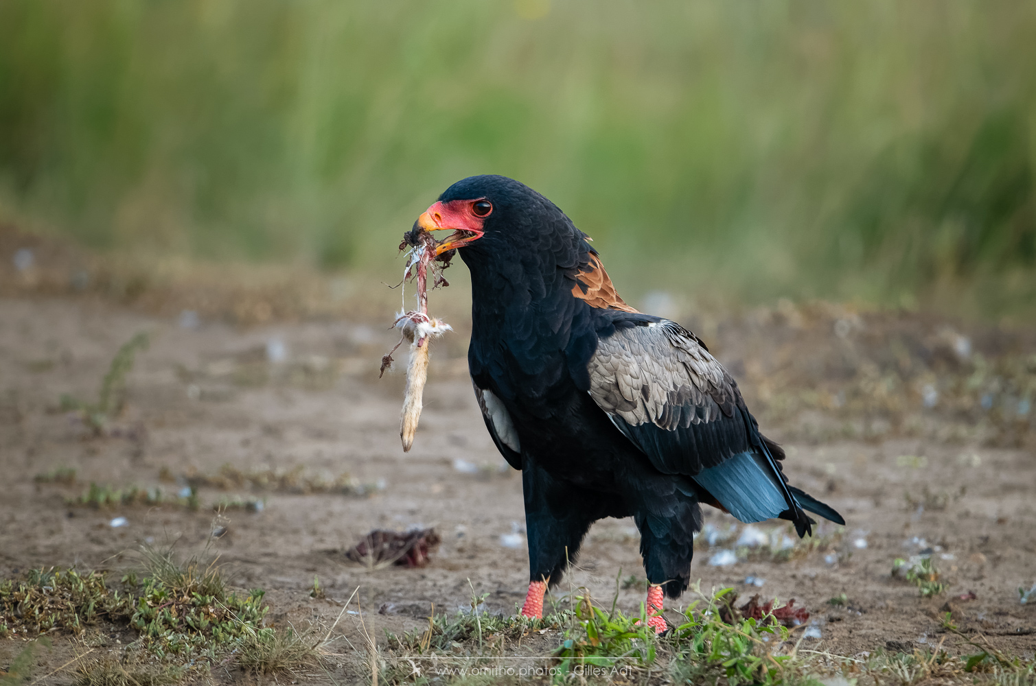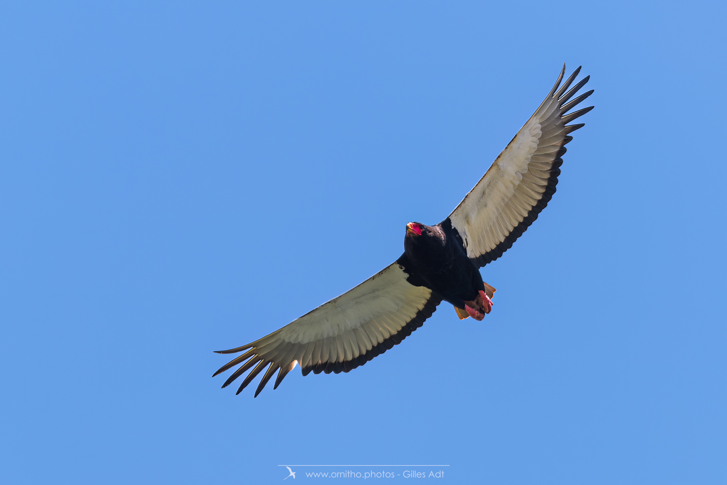 Le Bateleur des Savanes (Terathopius ecaudatus) est le rapace africain le plus coloré : l’adulte est noir avec le dos roux, les pattes et la peau nue de la base du bec sont rouge-orange. Le juvénile est très différent car brun-roux. Avec ses 1m90 d’envergure c’est un des plus beaux rapaces africain.