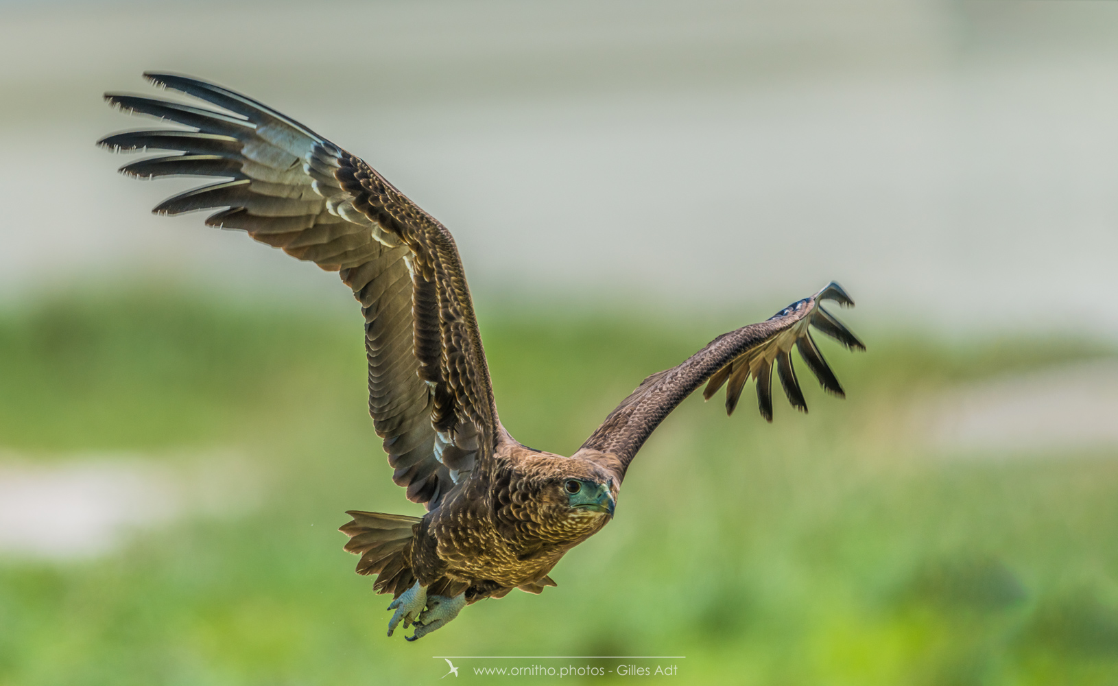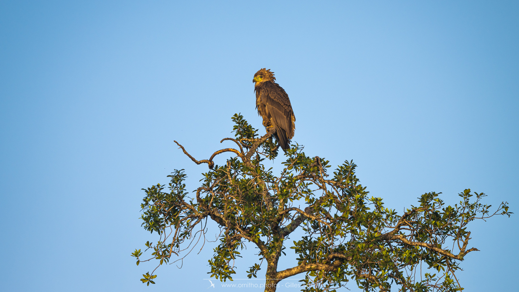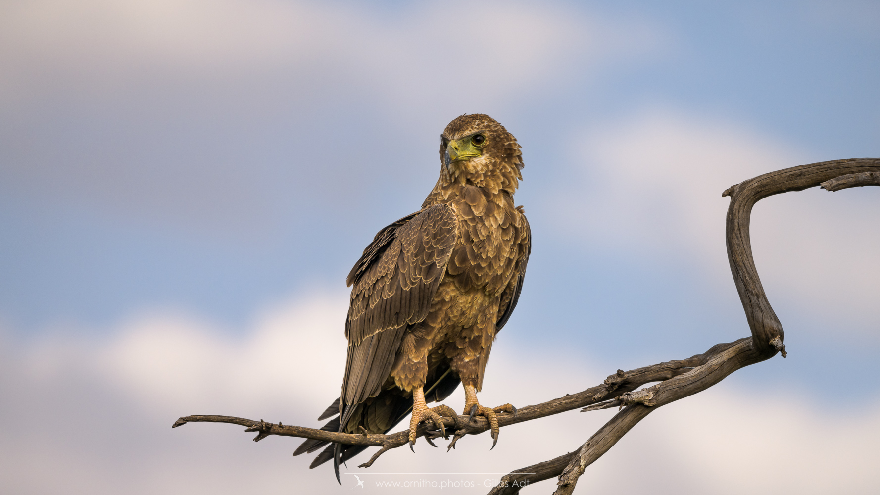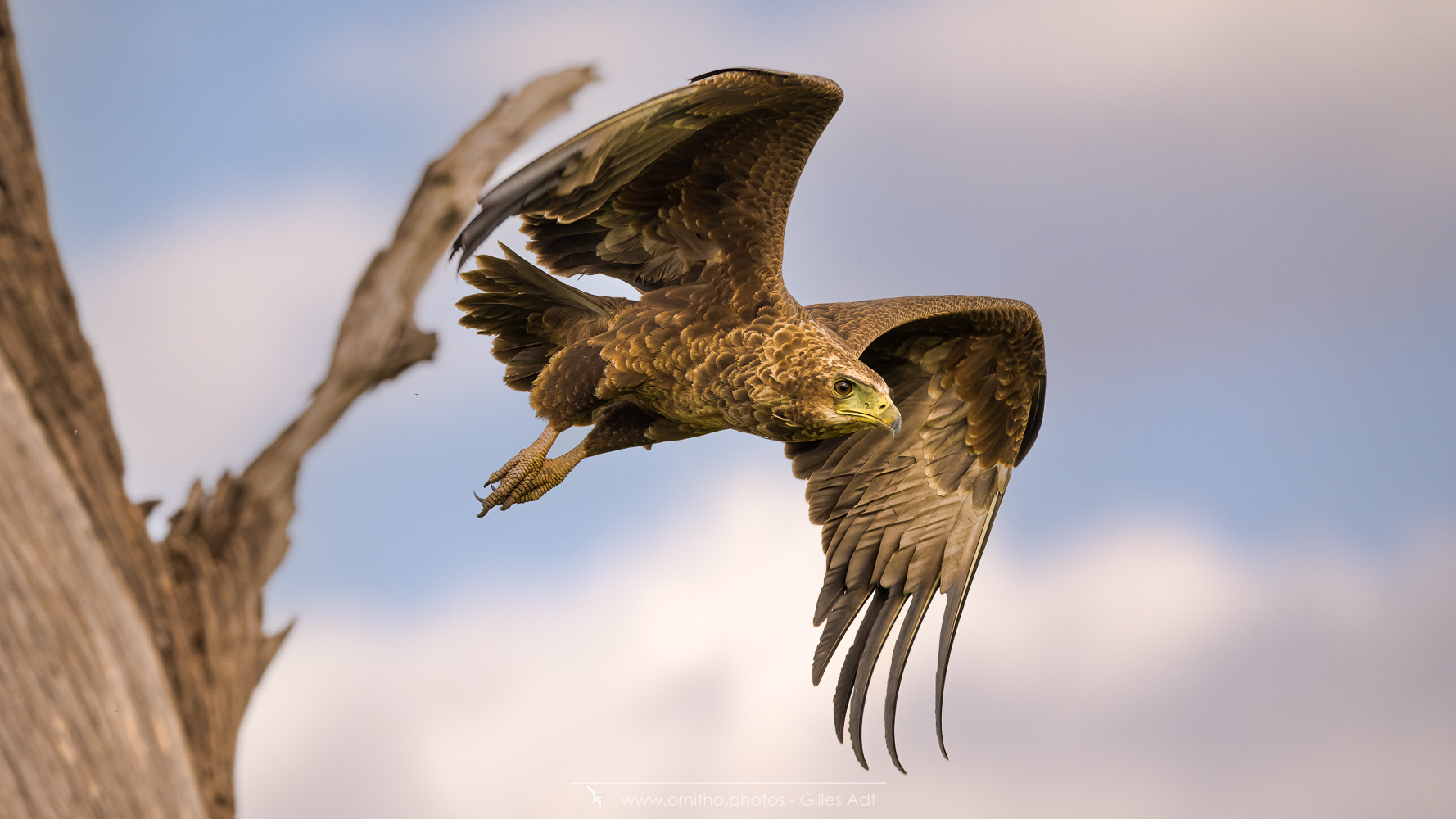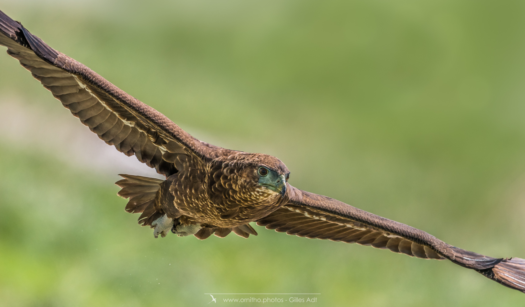 Le Bateleur des Savanes (Terathopius ecaudatus) est le rapace africain le plus coloré : l’adulte est noir avec le dos roux, les pattes et la peau nue de la base du bec sont rouge-orange. Le juvénile est très différent car brun-roux. Avec ses 1m90 d’envergure c’est un des plus beaux rapaces africain.