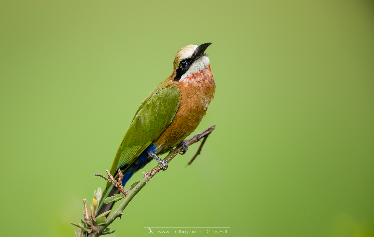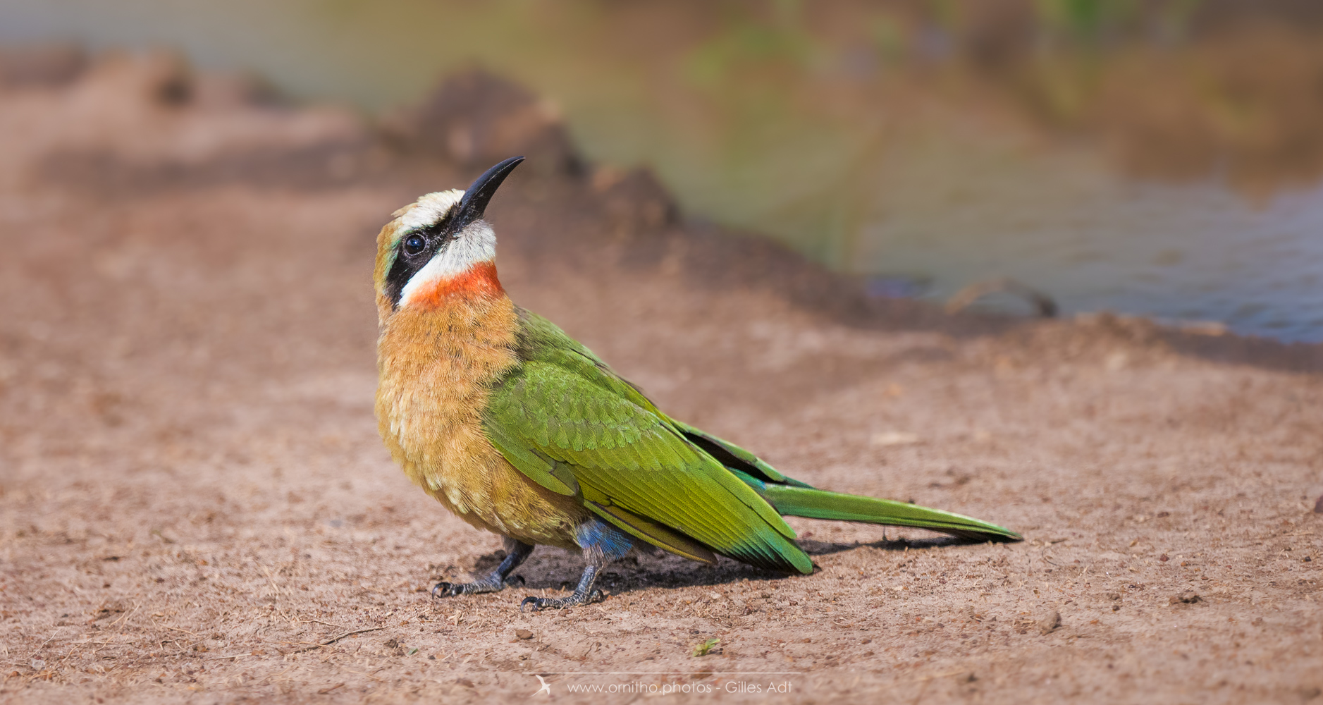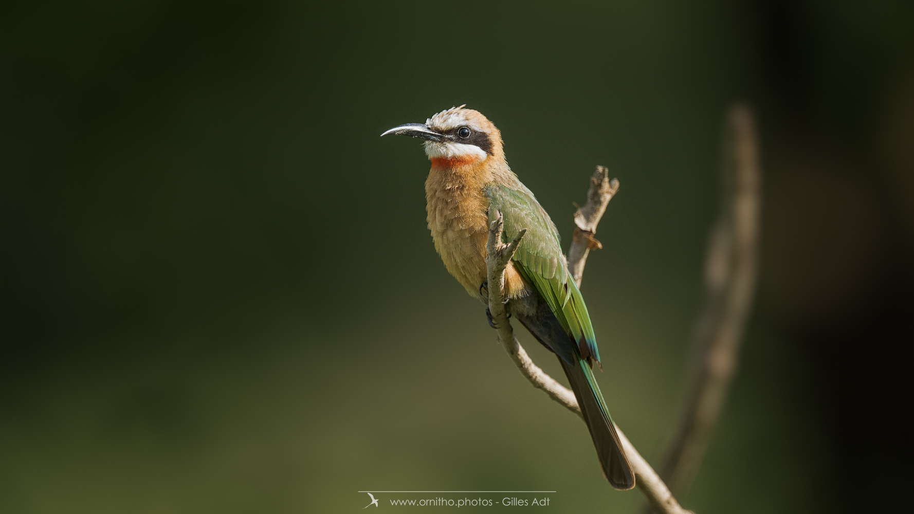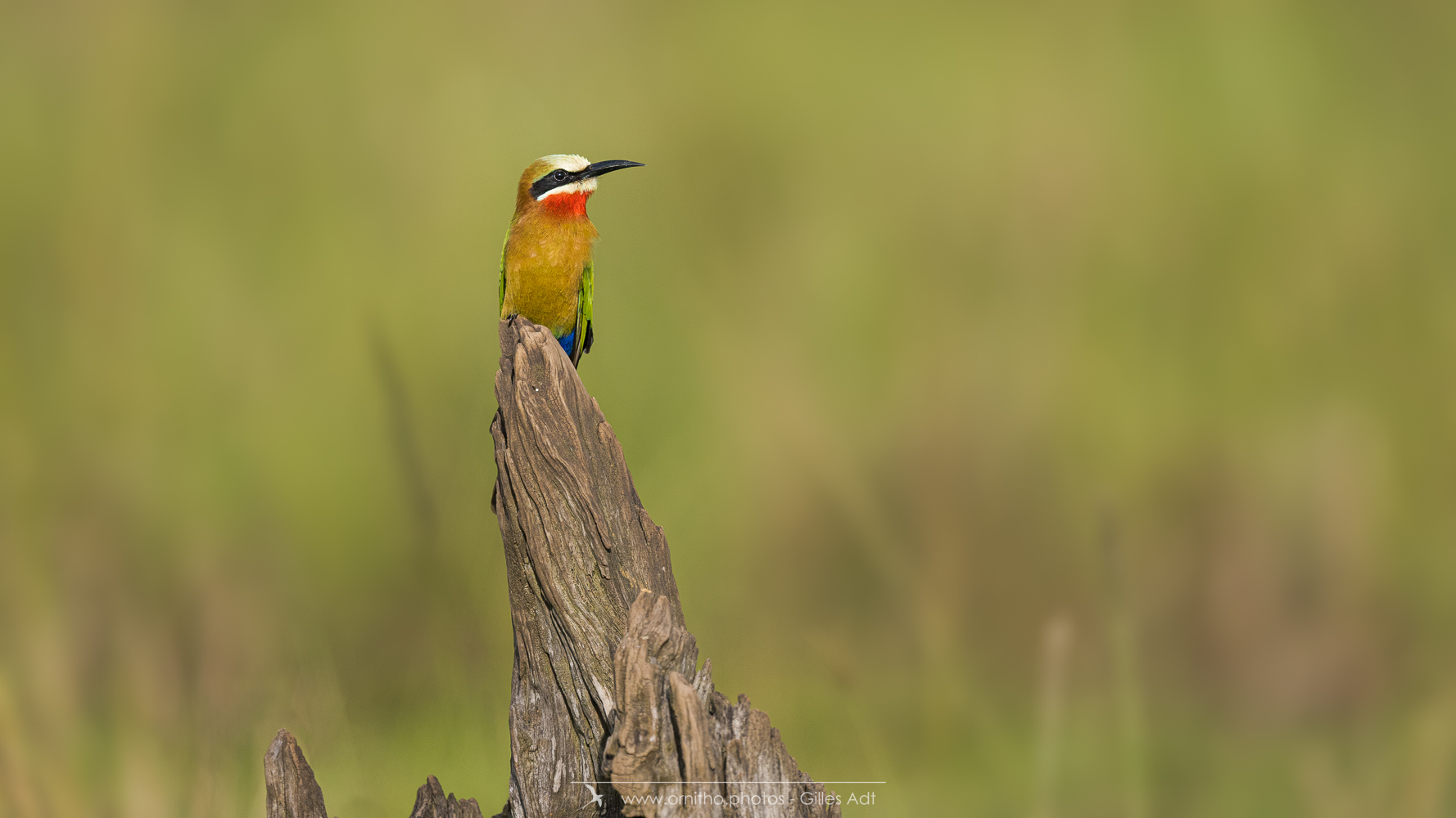 Encore un oiseau africain très coloré: le Guêpier à front blanc (Merops bullockoides). Et c’est une vraie palette d’artiste: du blanc sur la tête, un masque noir, la tête et la nuque en chamois foncé, du vert bleuâtre pour les ailes, les sus-caudales en bleu-outremer et la gorge rouge. Tout cela en une vraie harmonie ! Bravo Dame Nature