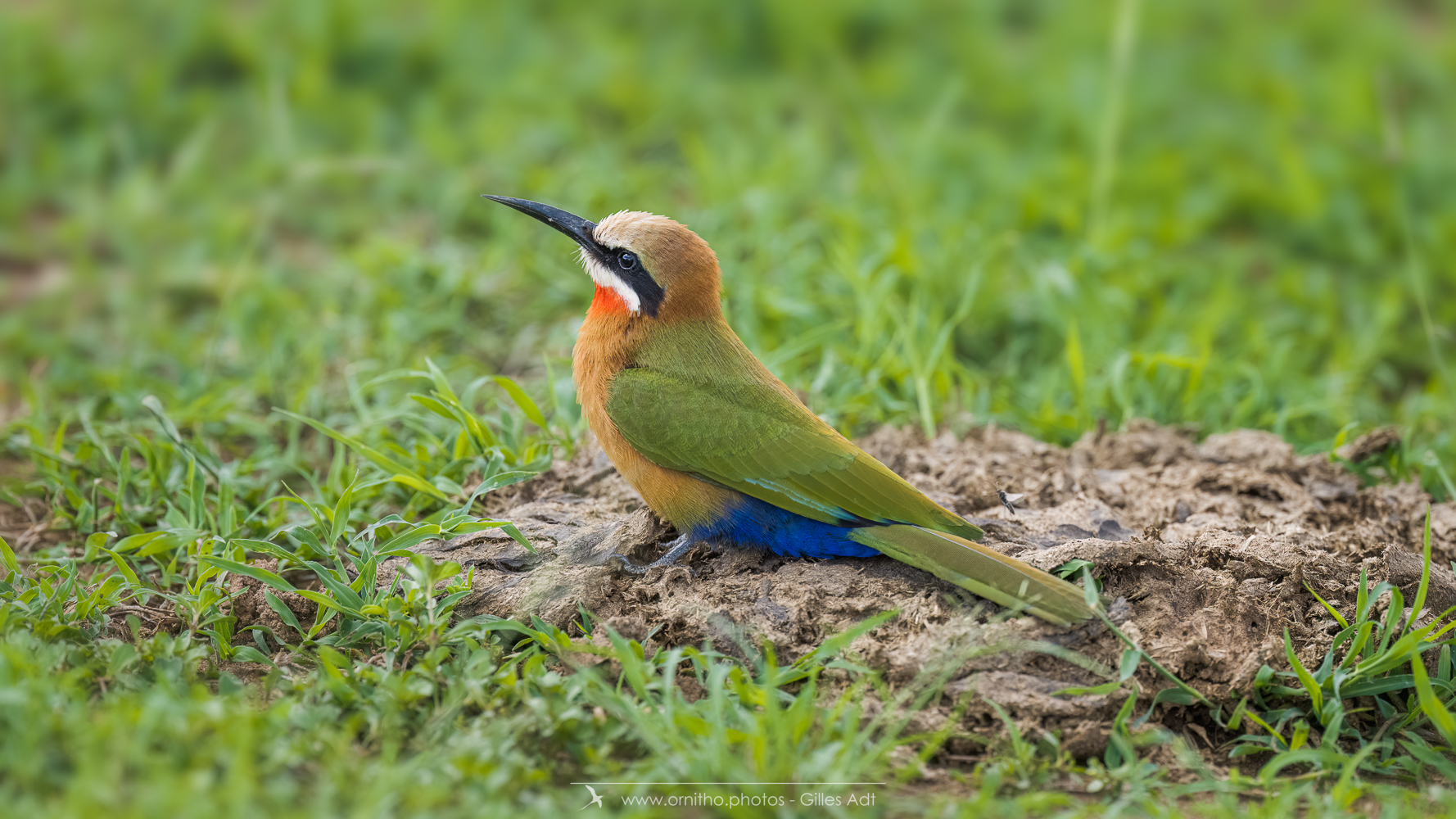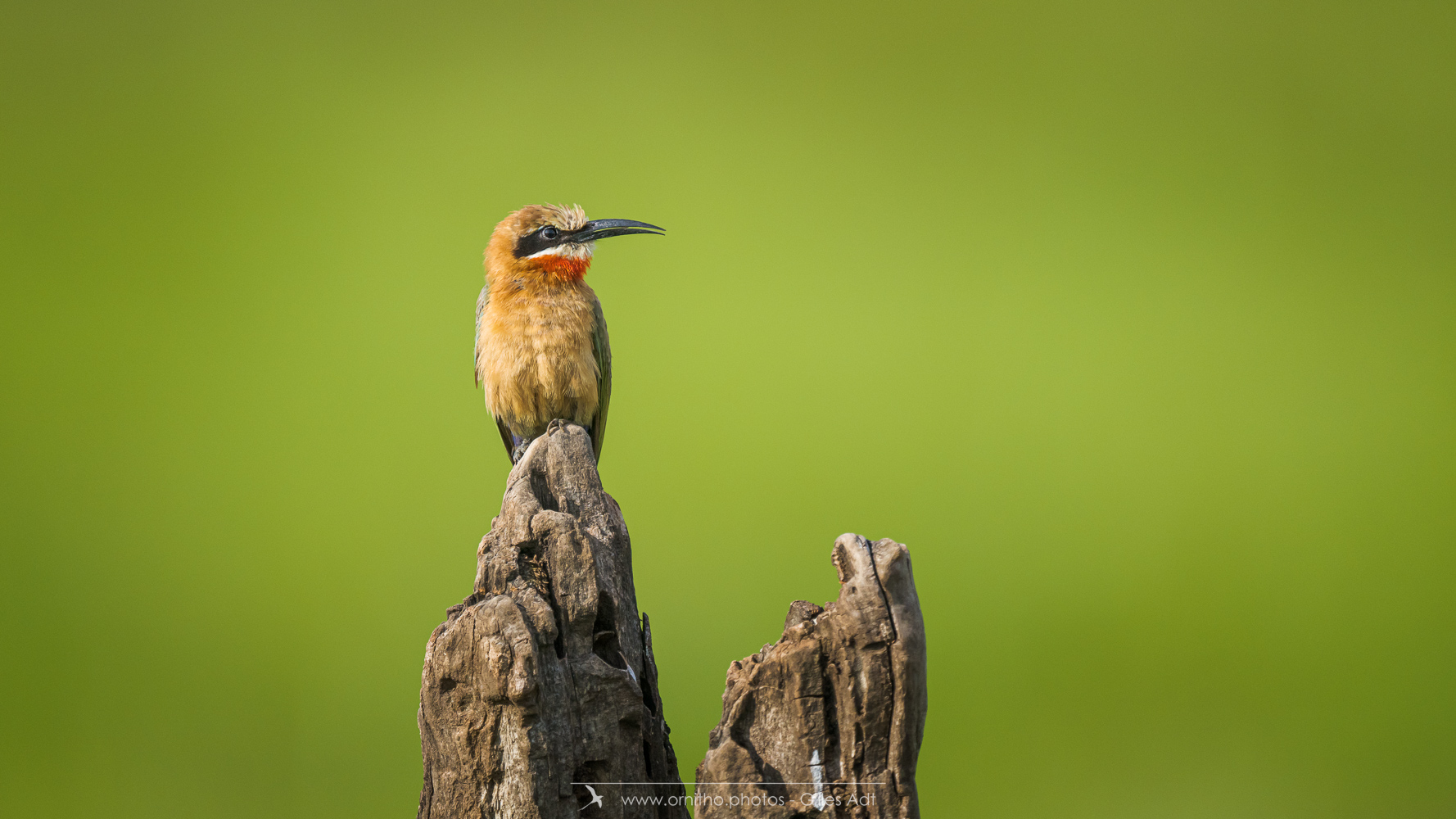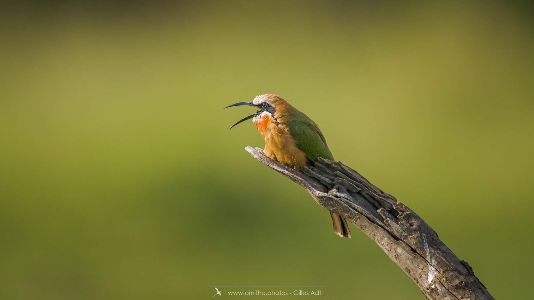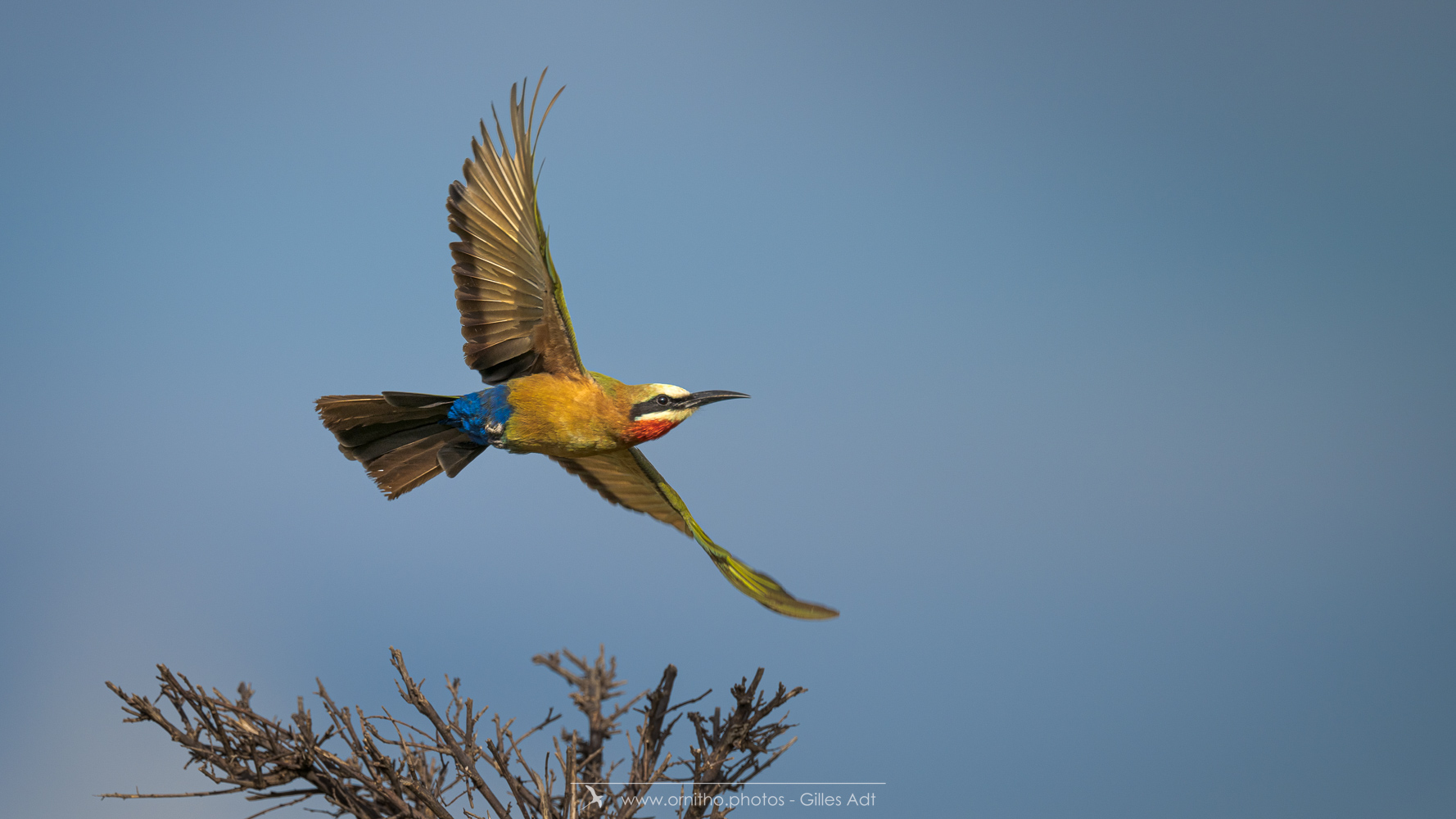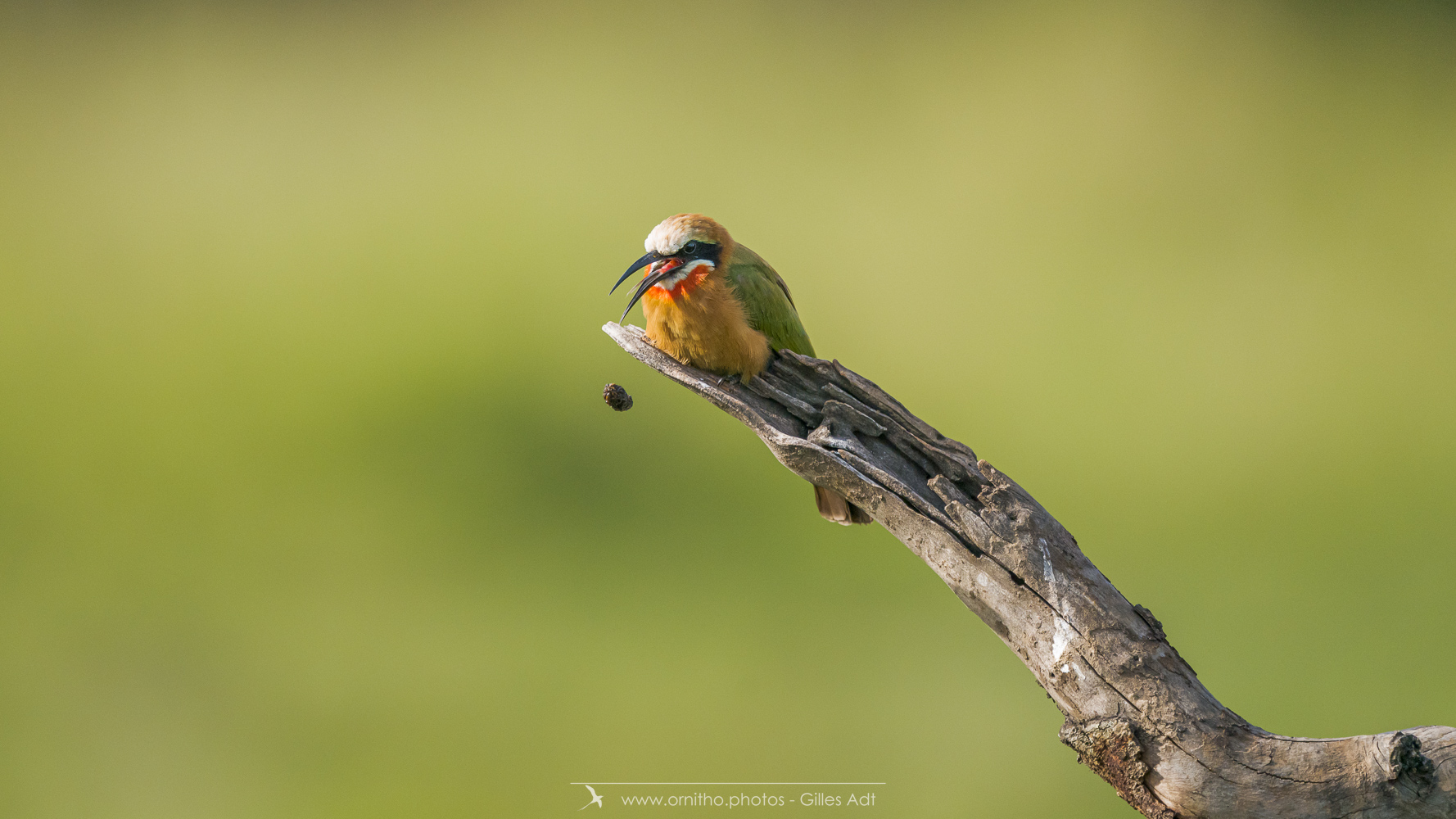 Encore un oiseau africain très coloré: le Guêpier à front blanc (Merops bullockoides). Et c’est une vraie palette d’artiste: du blanc sur la tête, un masque noir, la tête et la nuque en chamois foncé, du vert bleuâtre pour les ailes, les sus-caudales en bleu-outremer et la gorge rouge. Tout cela en une vraie harmonie ! Bravo Dame Nature