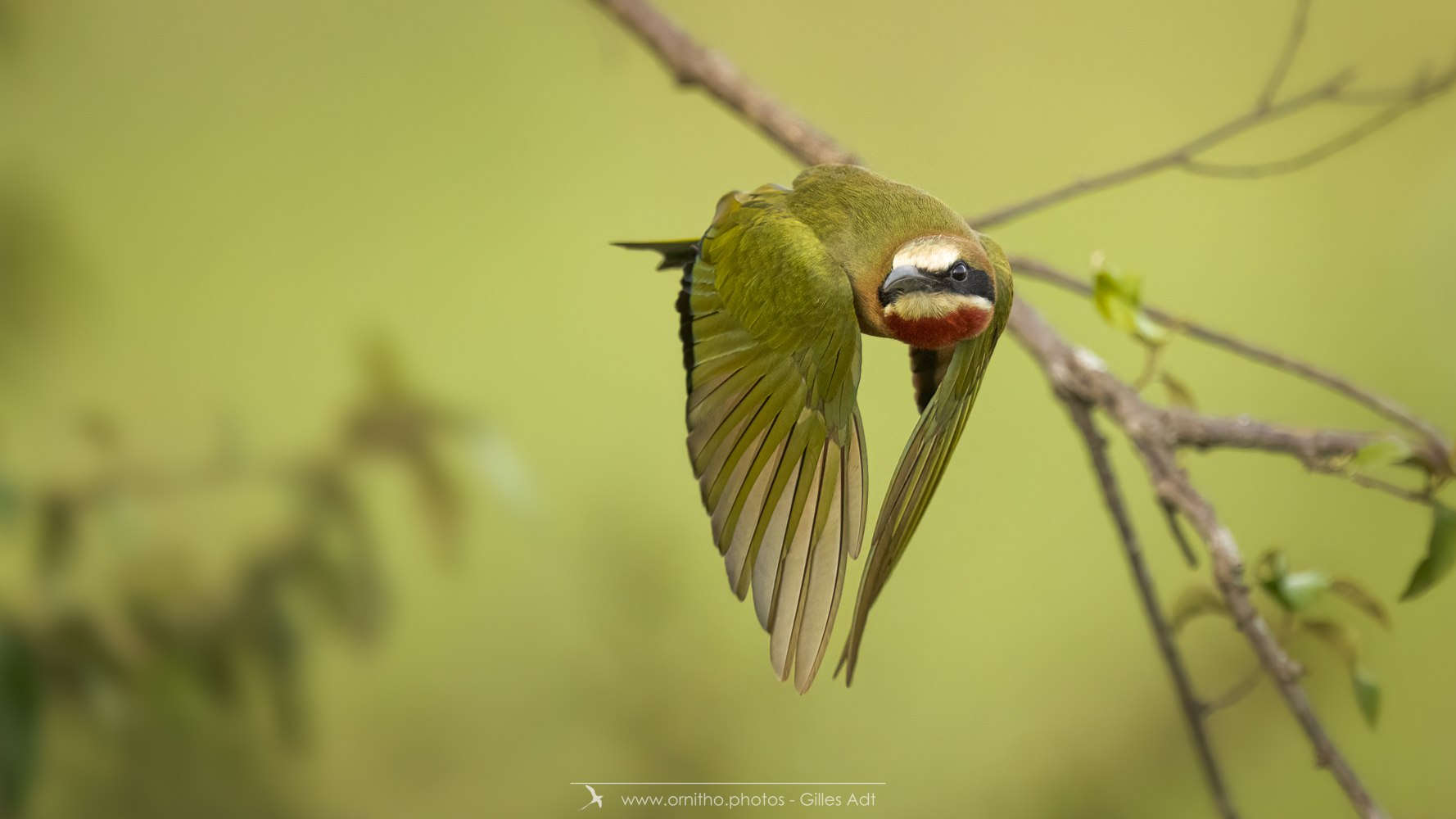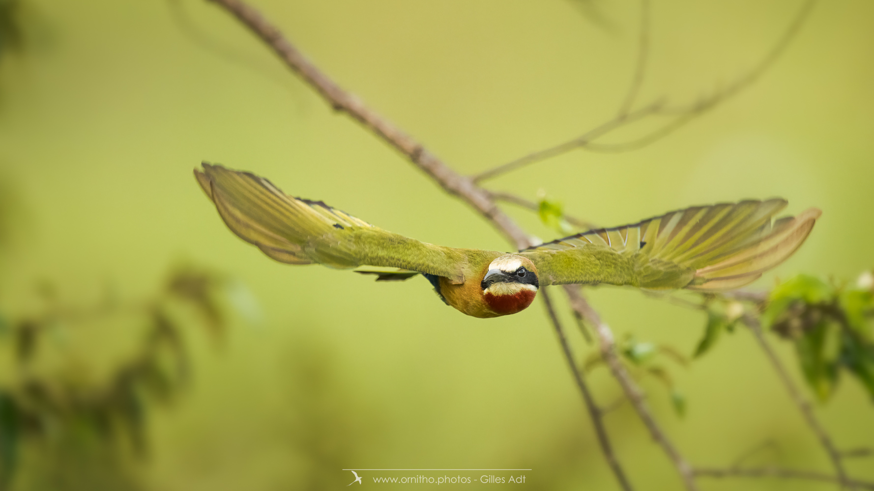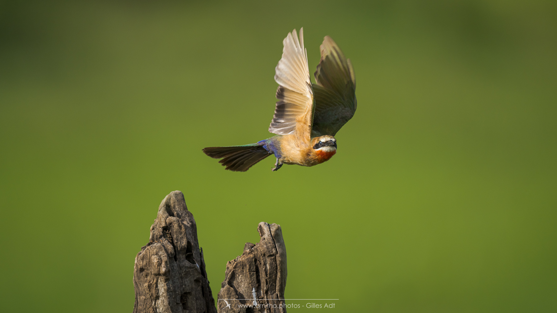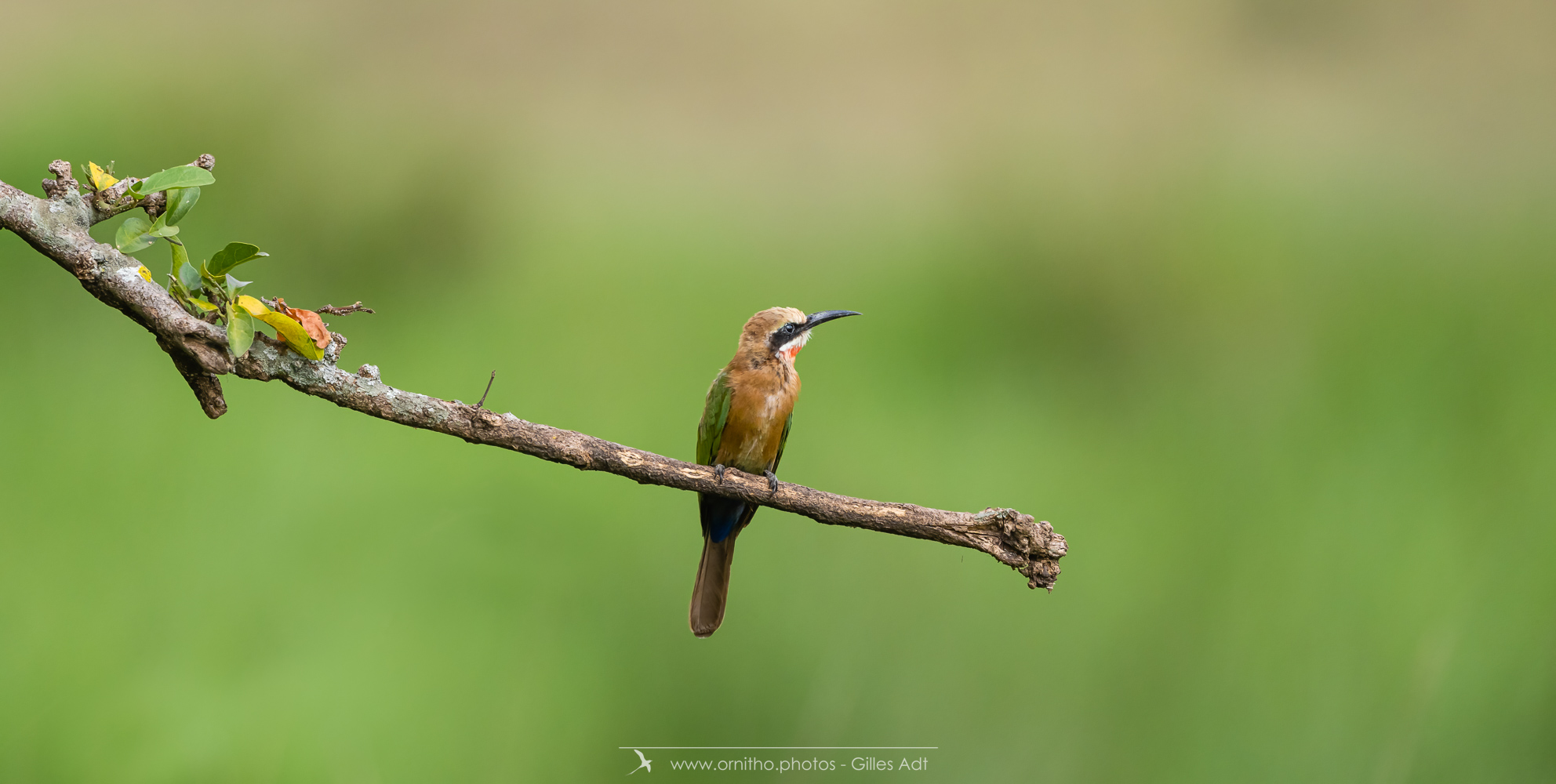 Encore un oiseau africain très coloré: le Guêpier à front blanc (Merops bullockoides). Et c’est une vraie palette d’artiste: du blanc sur la tête, un masque noir, la tête et la nuque en chamois foncé, du vert bleuâtre pour les ailes, les sus-caudales en bleu-outremer et la gorge rouge. Tout cela en une vraie harmonie ! Bravo Dame Nature