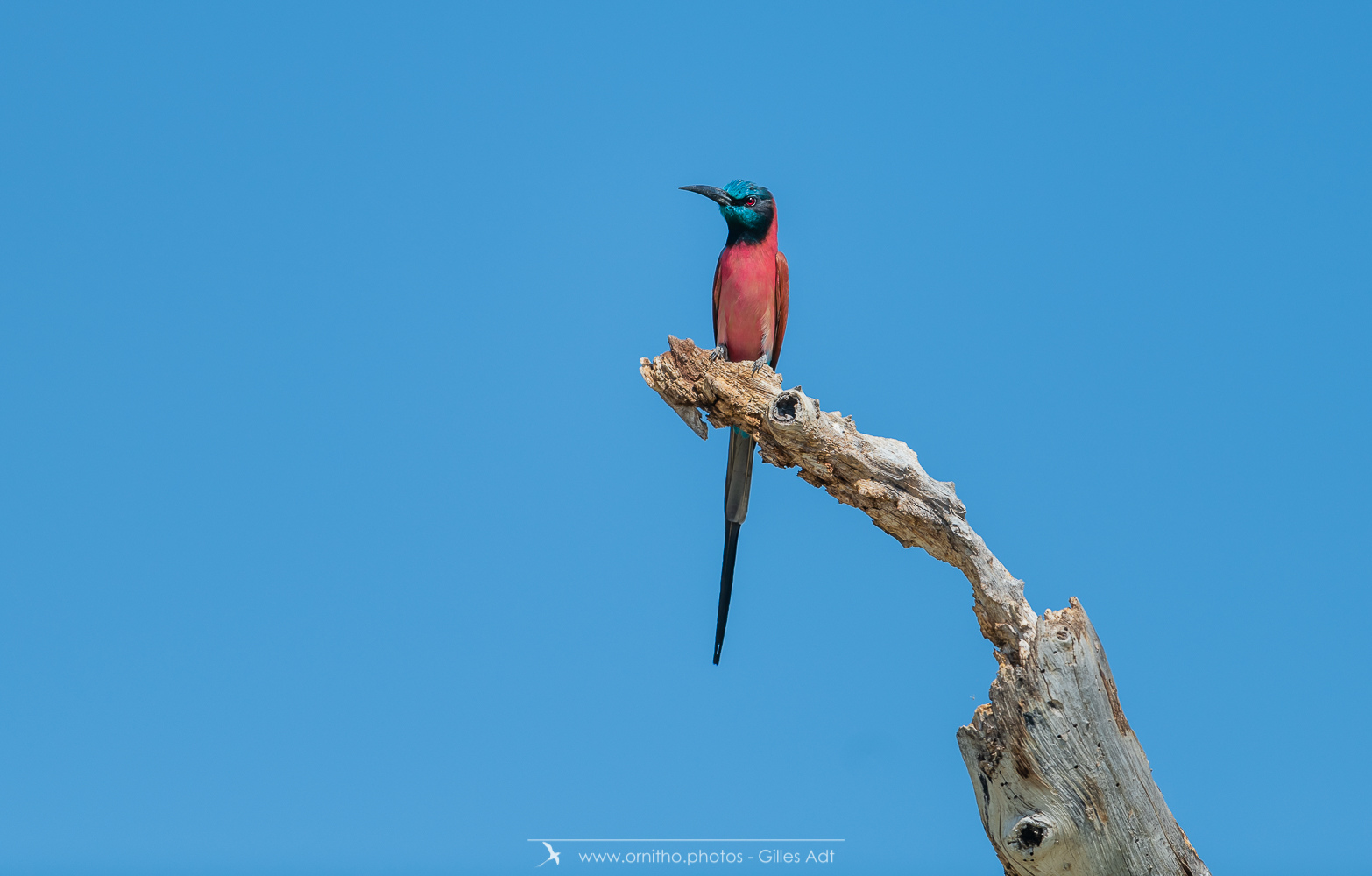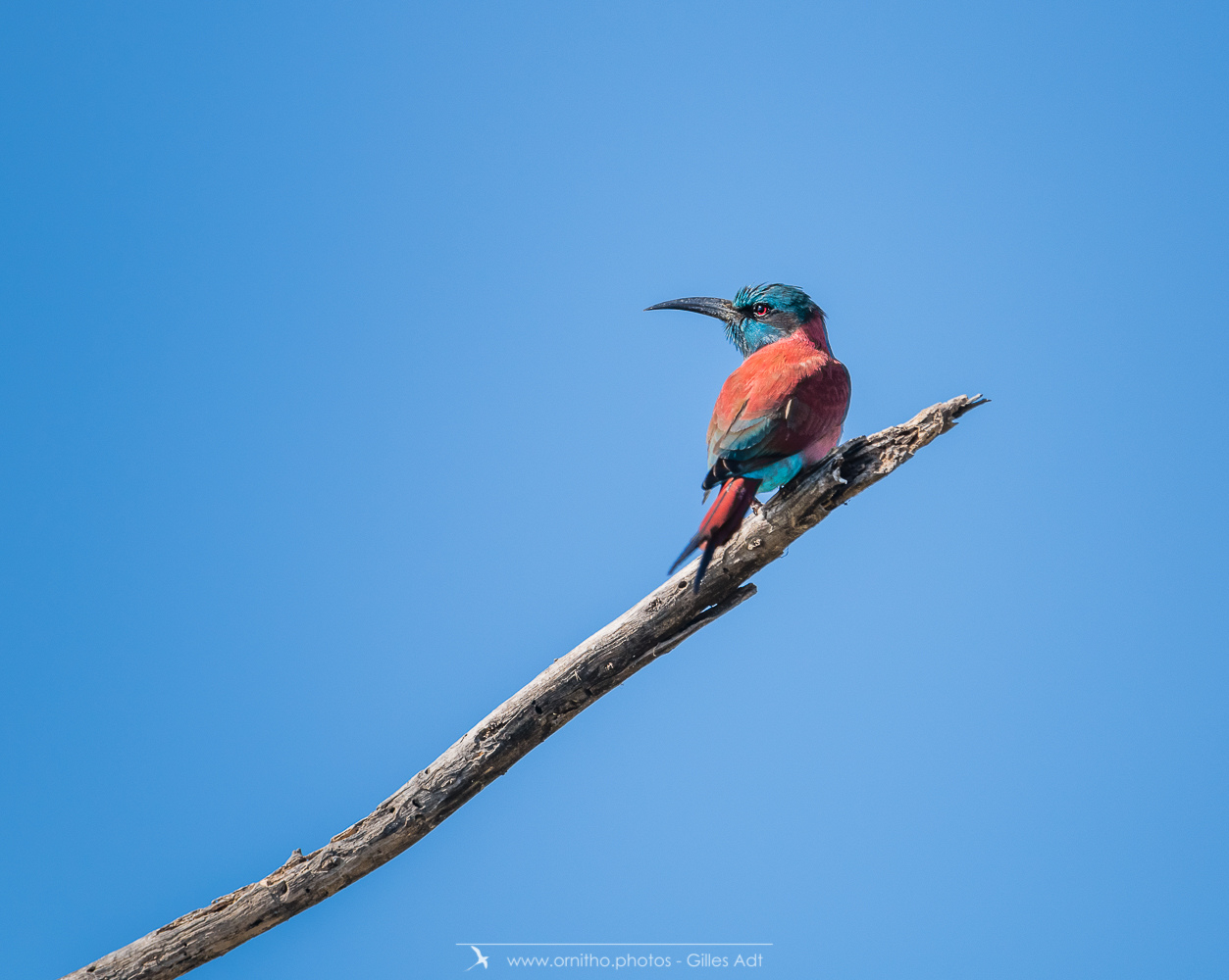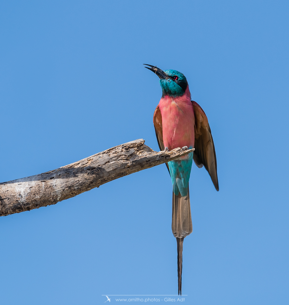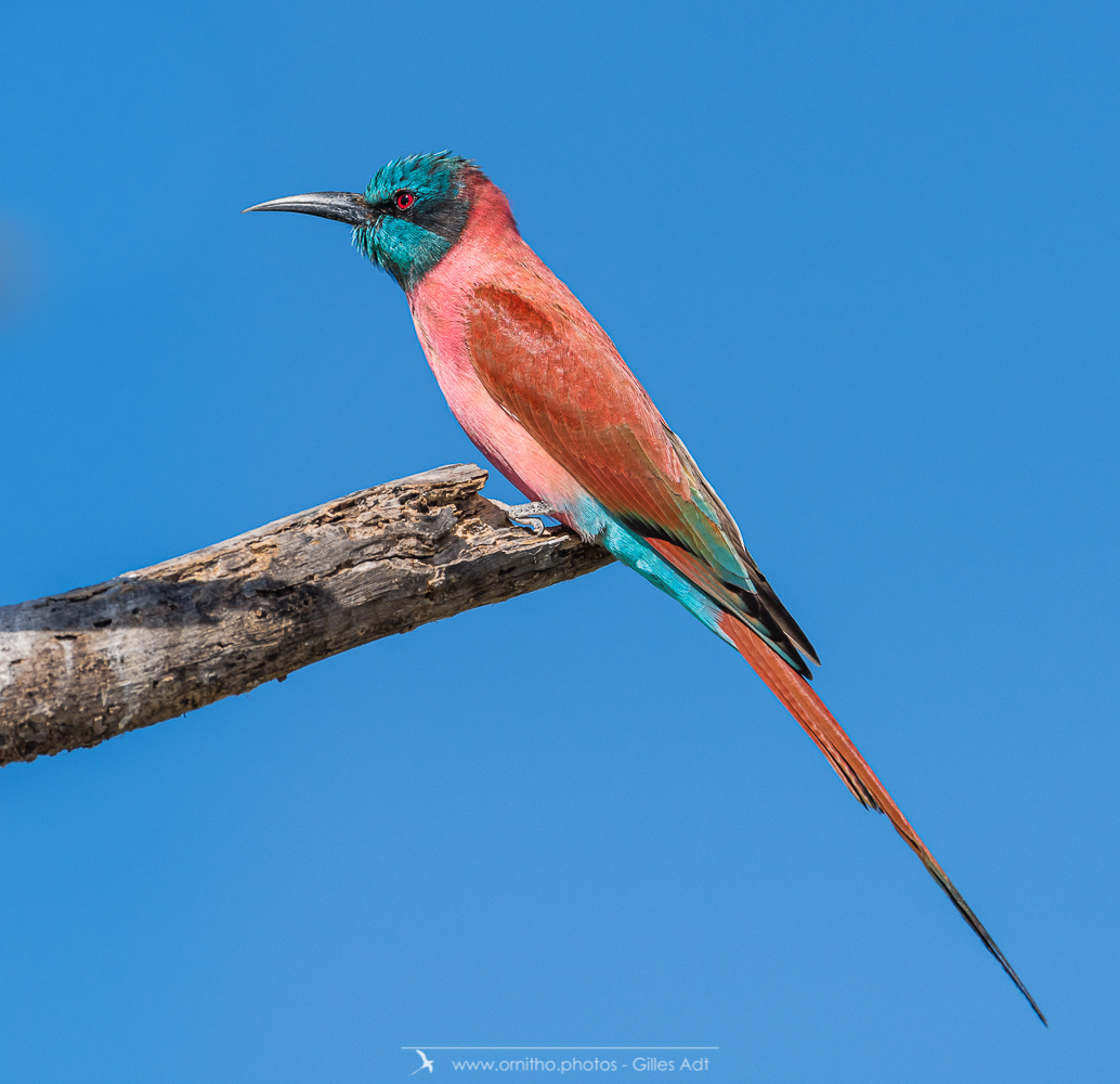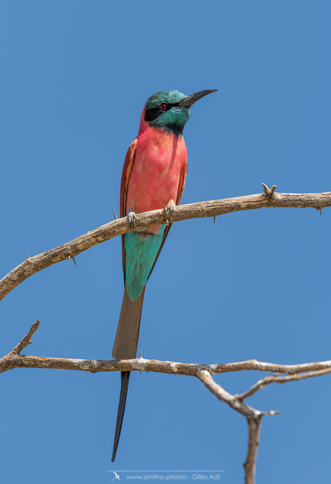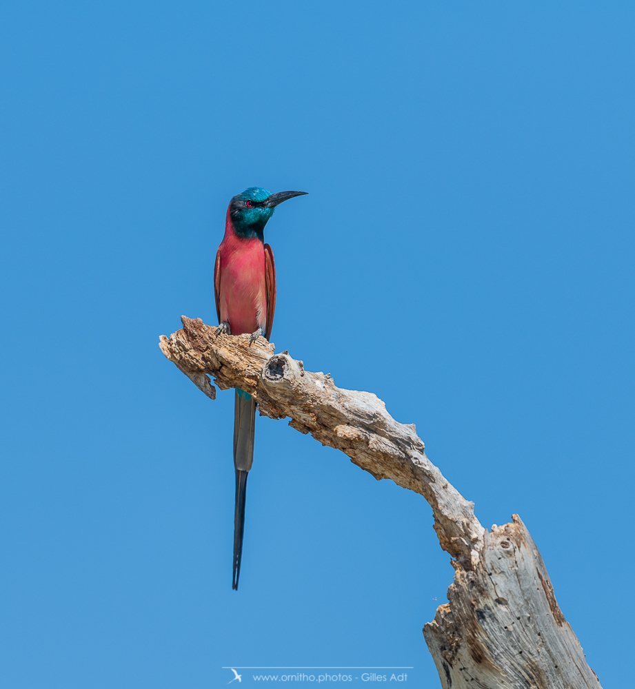 Encore un oiseau très coloré, le Guêpier écarlate (Merops nubicus). Le Guêpier écarlate a une robe écarlate, un capuchon bleu et l’œil rouge…. Juste magique à observer dans toute l’Afrique tropicale.