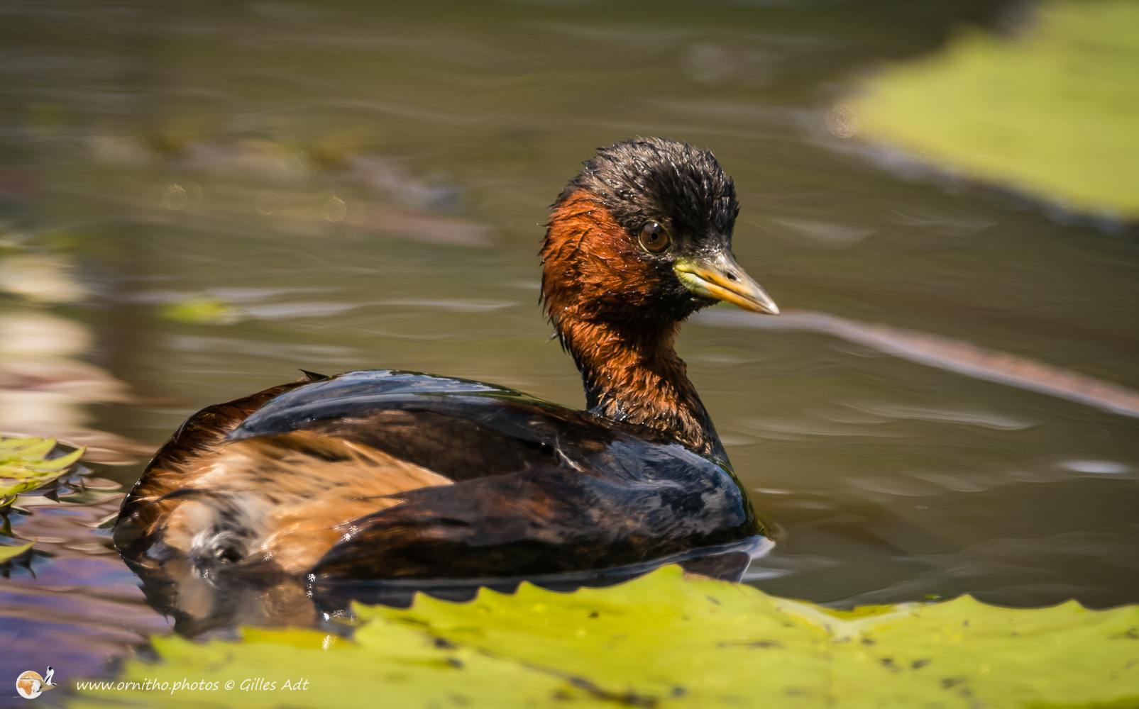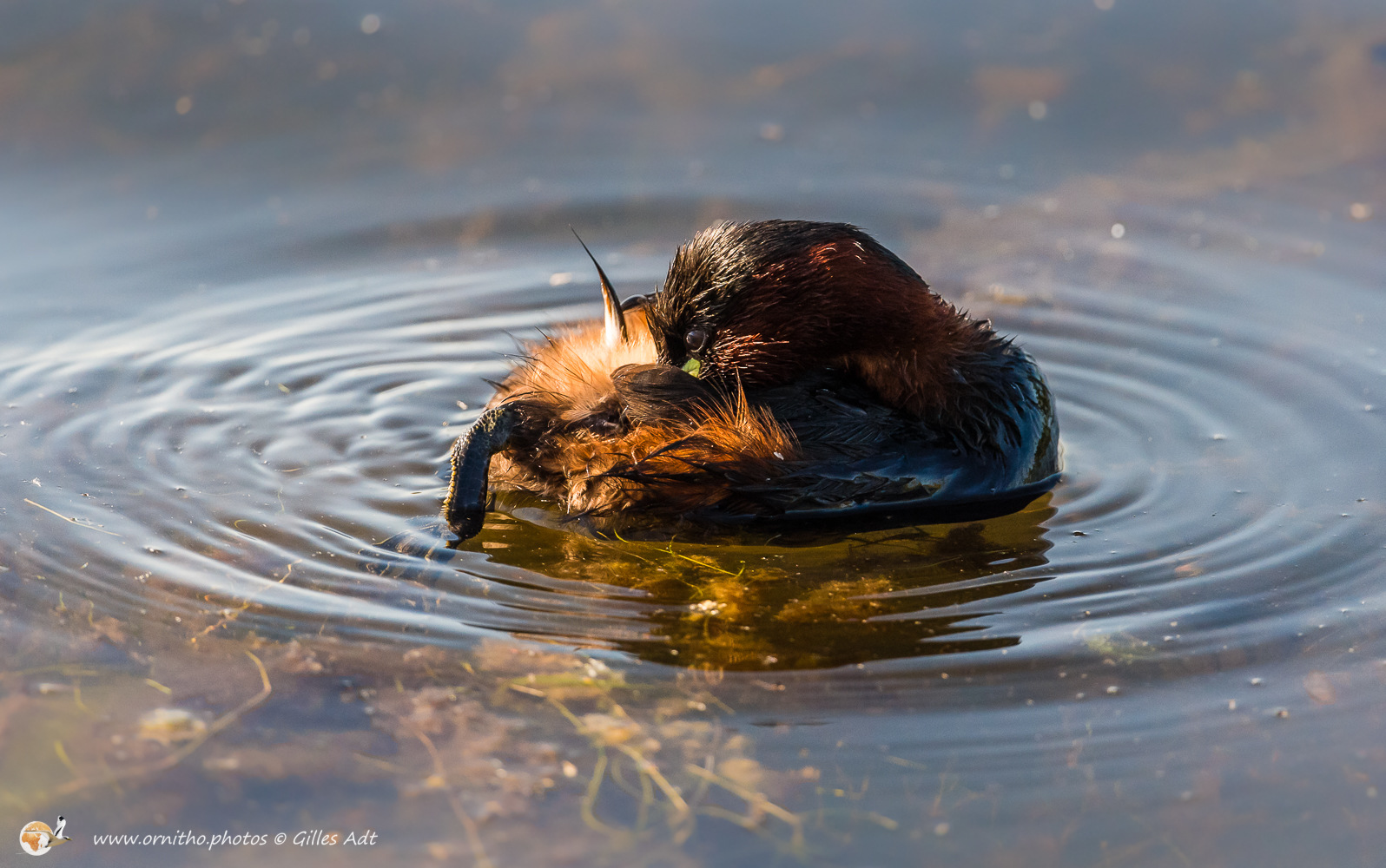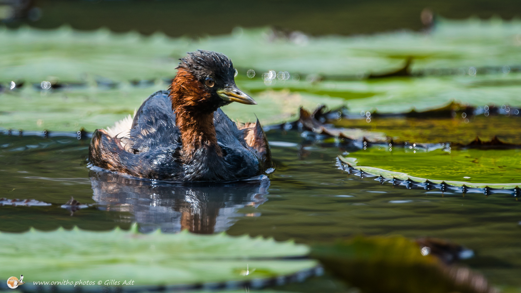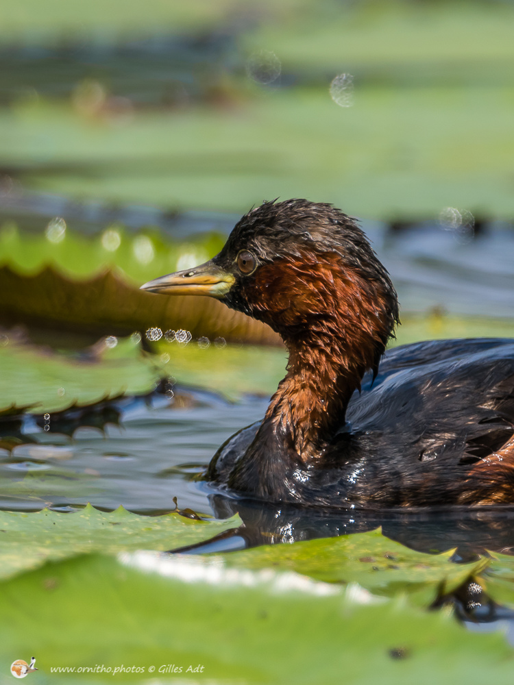 Le Grèbe castagneux (Tachybaptus ruficollis – Little Grebe) est le plus petit des 23 espèces de Grèbes. Immédiatement identifiable avec sa joue rousse en plumage nuptial et sa petite tête ronde. Il vit sur les étangs où il construit son nid constitué de roseaux ou branchages comme un radeau.