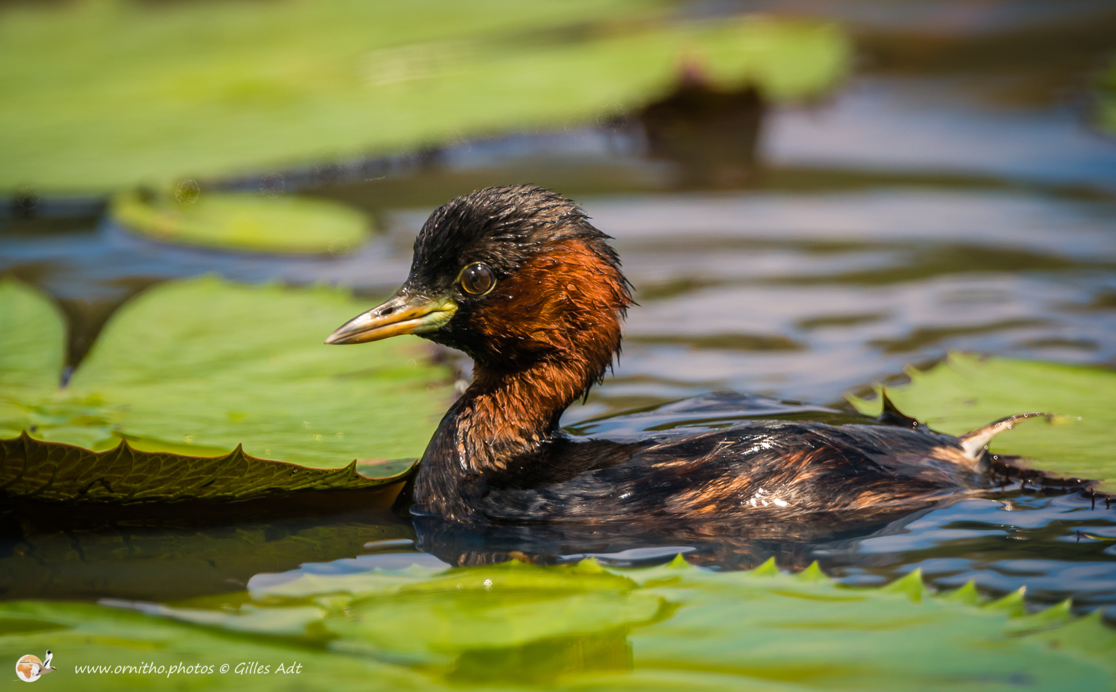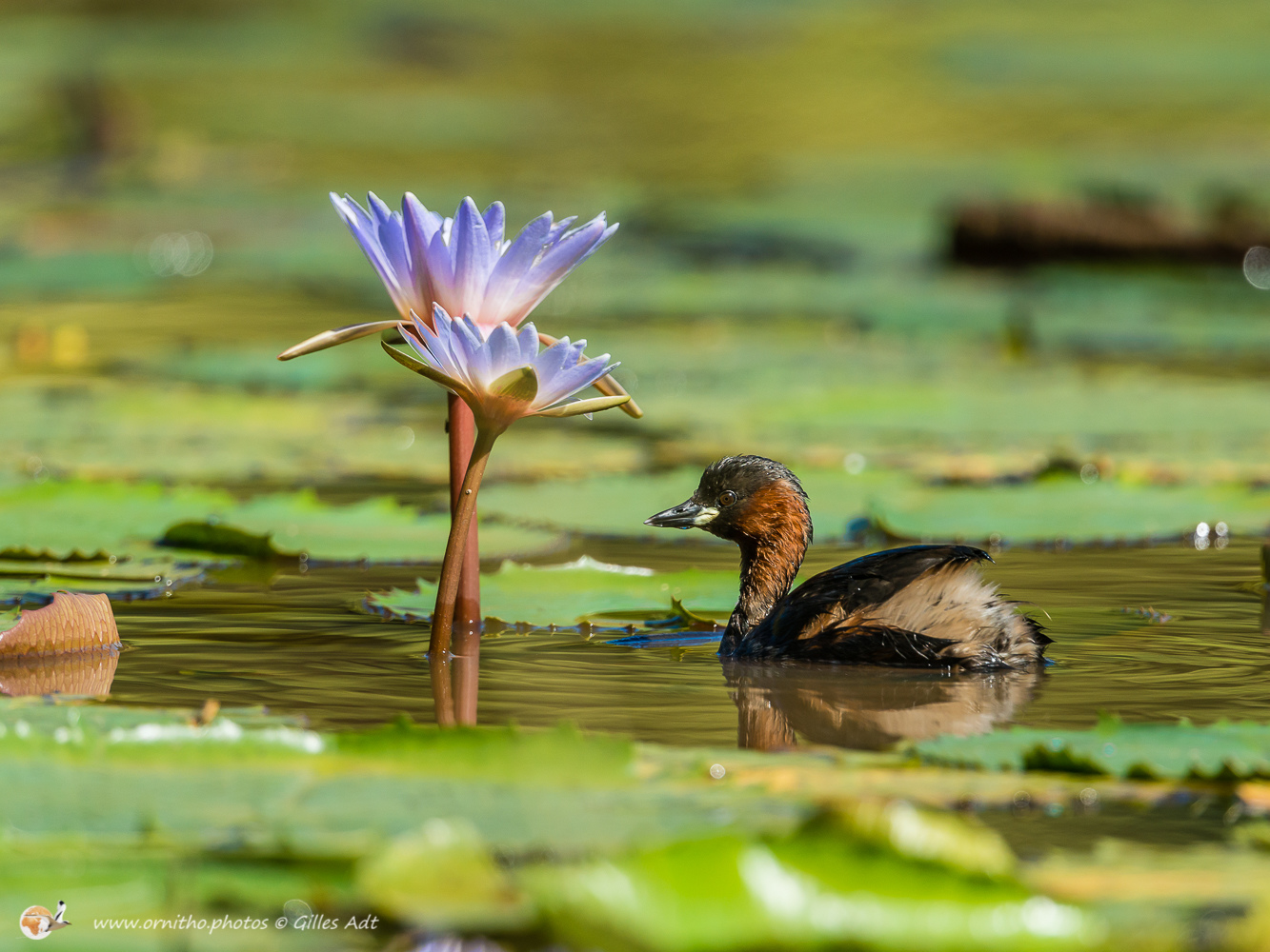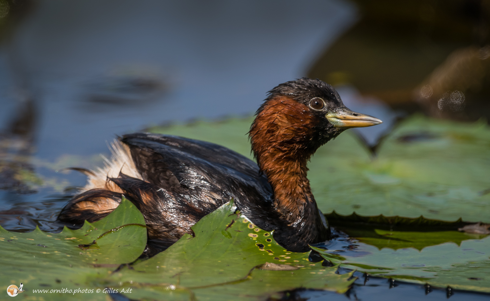 Le Grèbe castagneux (Tachybaptus ruficollis – Little Grebe) est le plus petit des 23 espèces de Grèbes. Immédiatement identifiable avec sa joue rousse en plumage nuptial et sa petite tête ronde. Il vit sur les étangs où il construit son nid constitué de roseaux ou branchages comme un radeau.